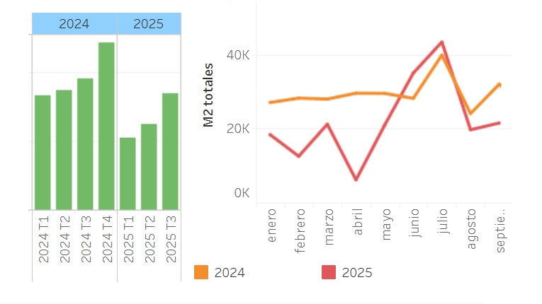 Las estadísticas no miden la cantidad de construcciones en curso sino obras nuevas aprobadas por la Dirección de Obras Particulares (no incluyen las no declaradas, ampliaciones ni regularizaciones) y la comparación es con idéntico período del año anterior. Si el tercer trimestre de 2025 se compara con el de 2023, la caída es de pocos metros cuadrados (84.635 y 85.402 m2, respectivamente) y en la sumatoria de los 9 meses, el ejercicio en curso está 5,3 % por encima.